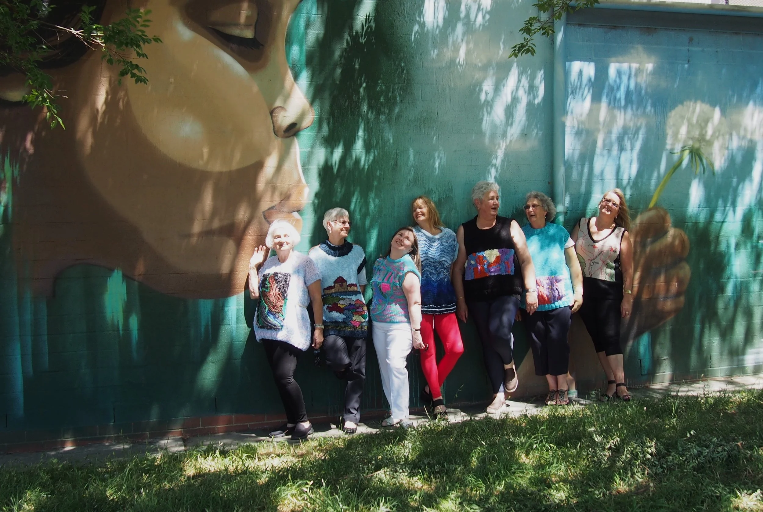 Roslyn McDonald, Isabel Devlin, Liz Brown, Janette Hatch, Barbara Marassovich, Pat Skien and Maria Hall, Place Patterns (2017). The women wear their handknitted map vests next to Tuggeranong Arts Centre. Photo credit: Lucy Irvine