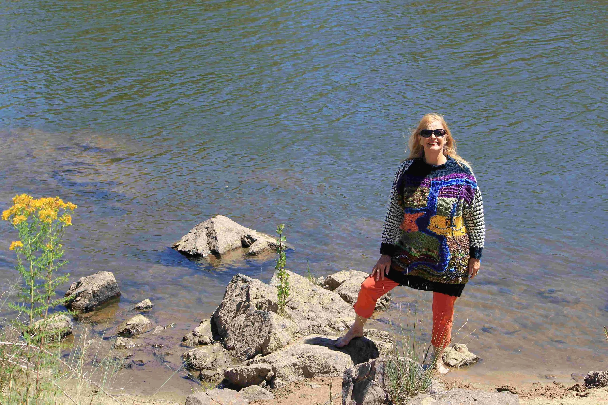 Janette Hatch, Place Patterns (2017). Janette wears her handknitted map vest on the banks of the Murrumbidgee River. Photo credit: Lucy Irvine